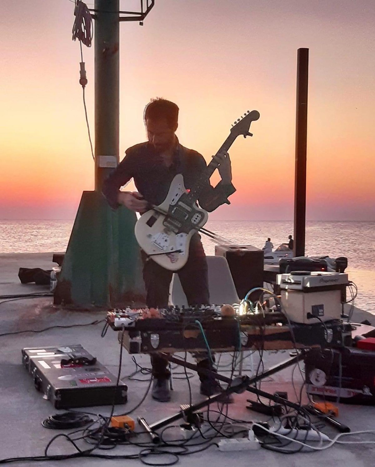 IN GIRUM IMUS NOCTE ET CONSUMIMUR IGNI, palindromo di incerta datazione e provenienza, reimpiegato da Guy Debord come titolo per uno dei suoi esperimenti cinematografici, è fonte di ispirazione per il nuovo progetto in solo di Stefano Pilia, che ne ha tratto un disco uscito nel 2019 per l’etichetta milanese Die Schachtel. Al molo di Cervia, sempre in solo, Pilia ha dato vita ad un’inedita esecuzione che ha impiegato parte di quei materiali, adottandone la struttura compositiva basata su cicli ricorsivi, in una struttura simmetrica, che ha accompagnato gli ascoltatori in un’immersione e riemersione da un mondo meditativo e profondo. Con espliciti riferimenti alchemici, la materia sonora dovrebbe qui manifestarsi dentro un processo ed il suo consumarsi: “Giriamo in tondo nella notte ed, ecco, veniamo consumati dal fuoco….A partire dal rapporto con la chitarra, il mio medium, entro nel campo del suono. Cerco una relazione con esso come se mi stessi rivolgendo ad un’entità animata, già in parte dotata di volontà propria, alla quale mi affido; lo immagino come una rete, un campo di forze con le quali entrare in relazione e all’interno delle quali voglio portare l’ascoltatore per permettergli di realizzare il suo viaggio”. (S.P.)